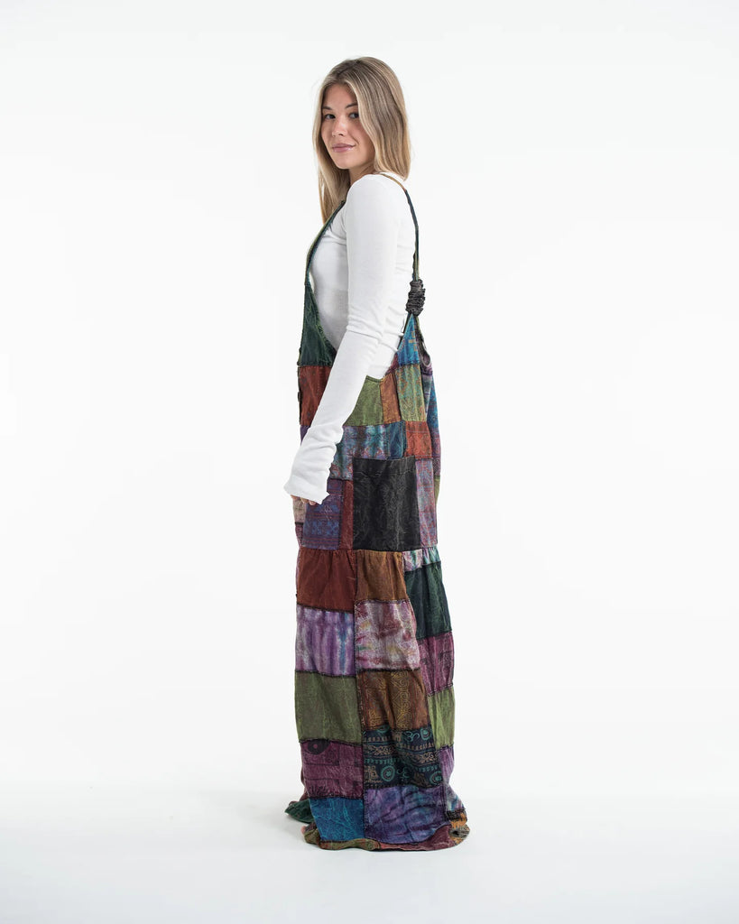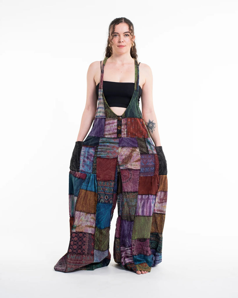 Perfectly handcrafted Indian patchwork stone-washed cotton overall with adjustable length and a button at the back. There are three holes to adjust the straps with a coconut button closure. One pocket in the front and two pockets on the side. Maximum comfort with roomy legs and an elastic back.