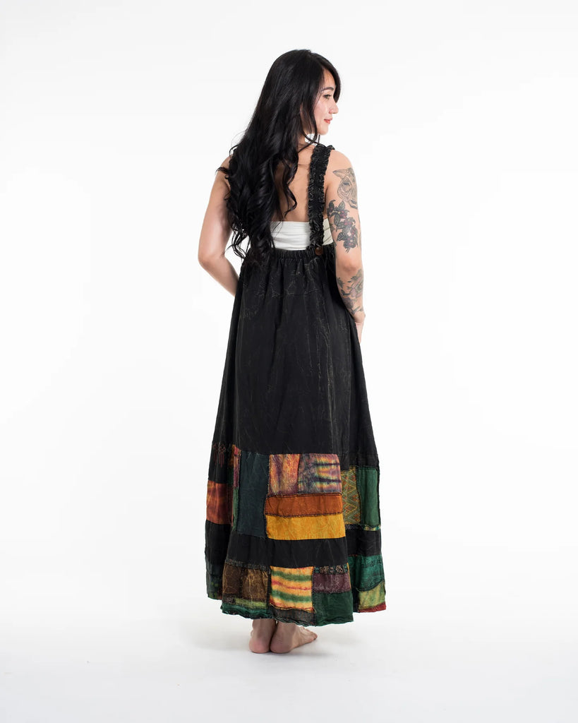 Perfectly handcrafted Indian patchwork stone washed cotton overall dress with adjustable length with a button at the back. There is 3 holes to adjust the straps with coconut buttons closure straps. Two pockets on the side. Maximum roomy comfort and with elastic at the back.